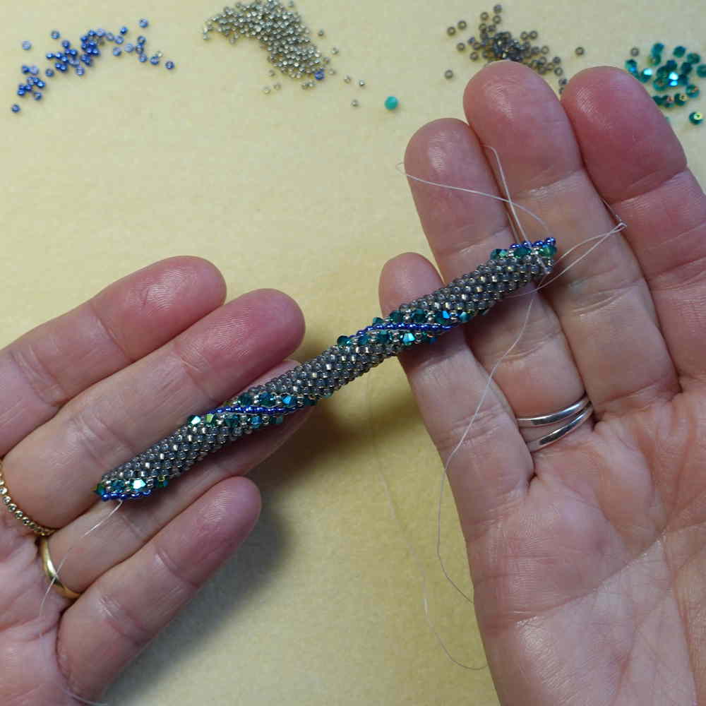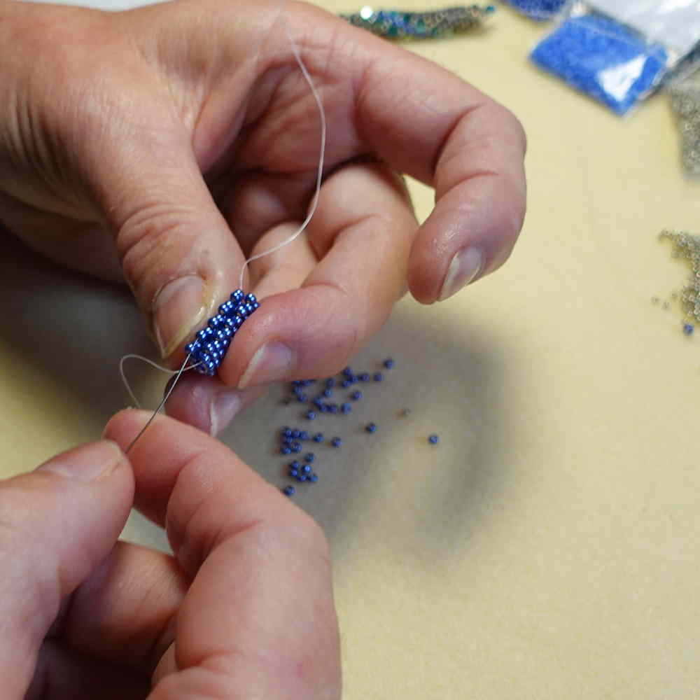 Auf tieferer Ebene empfinde ich das Fädeln, Weben und Nähen mit winzigen Perlen, um damit durchgehende Strukturen oder Gewebe zu erzeugen, als eine Art von Meditation. Dabei ist das Zusammenfügen von Perlen mit Nadel und Faden wie ein Puzzle, in dem jeder Teil den richtigen Platz findet, und dadurch zu Schönheit, Glanz und Form des Stücks beiträgt. Man kann dabei fast schon von einer philosophisch-spirituellen Erfahrung sprechen.